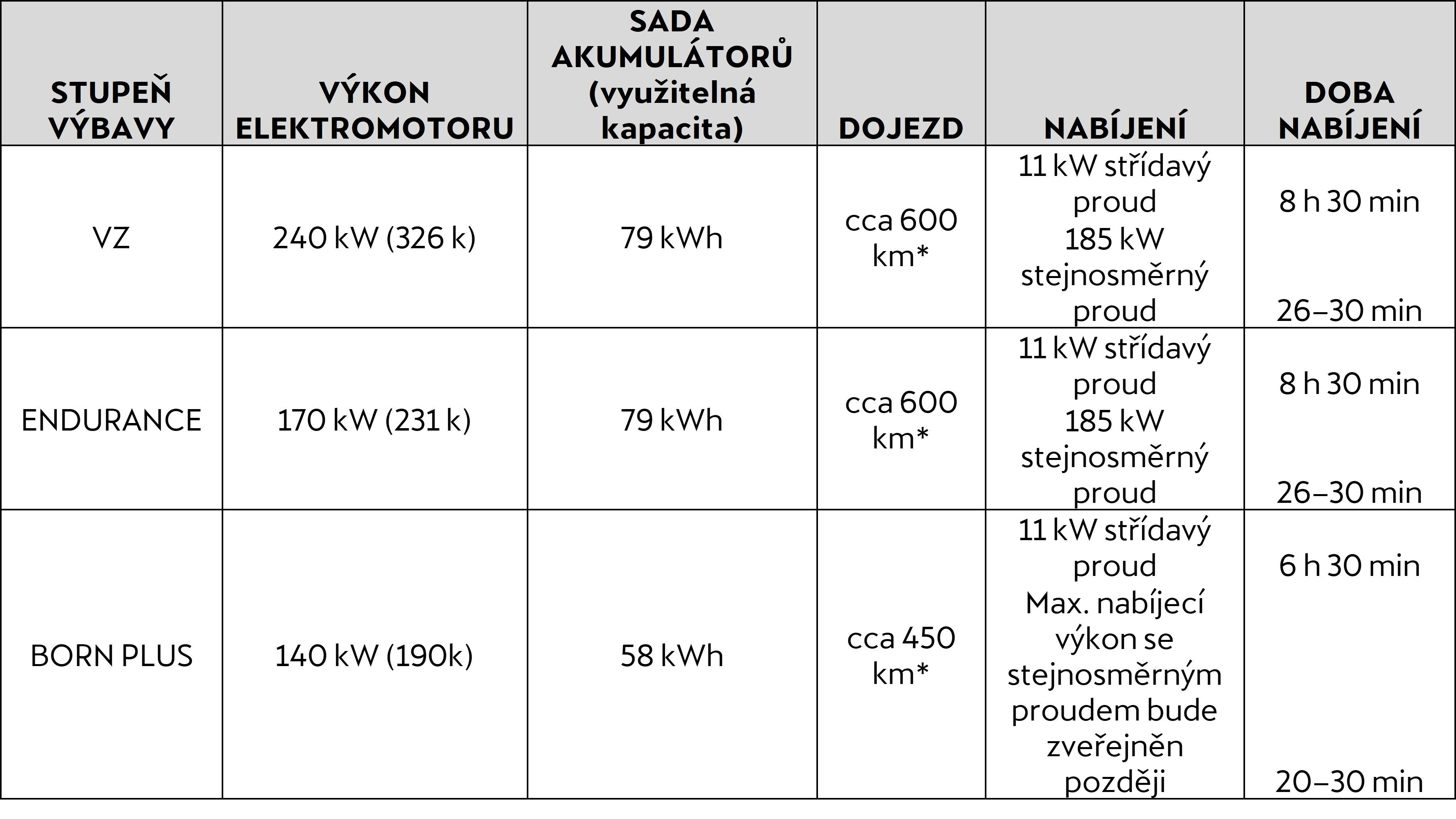 - Nová CUPRA Born VZ – poskytující nejvyšší úroveň sportovních výkonů značky CUPRA – bude k dispozici od uvedení nového modelu na trh; zákazníci se mohou těšit na nejvyšší výkon 240 kW, zrychlení z 0 na 100 km/h za pouhých 5,6 sekundy a příkladný dojezd cca 600 km